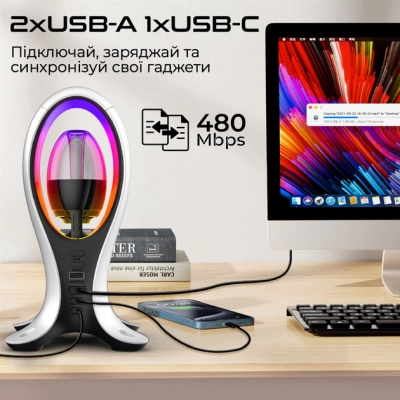 - 2xUSB-А, 1хUSB-C: Підключай, заряджай та синхронізуй свої ігрові гаджети на швидкості 480 Мбіт/с та 1А.