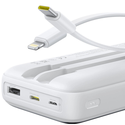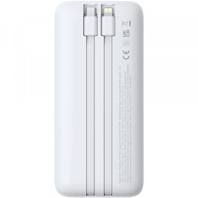 Ємність - 20000 mAh, електрохімічна система - Li-pol, Джерело заряду батареї - USB Type C, інтерфейси підключення (вихід) - USB Type-C, USB, вихідний струм - 1.5 A, 3 A, 2.22 A, 1.67 A, розмір - 152.2 x 69.6 x 30.7 мм, вага - 435 г, Колір - білий