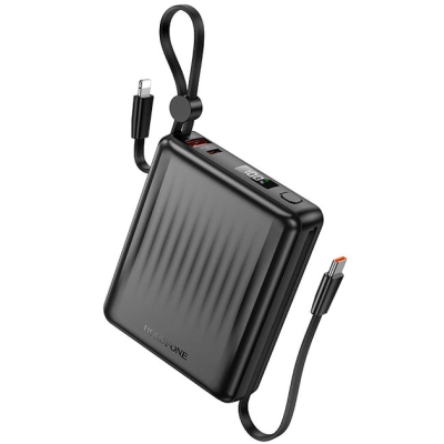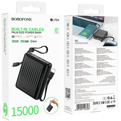 BOROFONE BJ70A Vigorous з двома вбудованими кабелями (USB-C та Lightning) забезпечить безперервну роботу ваших пристроїв, де б ви не знаходилися. Корпус з ABS-пластику та полікарбонату не тільки надає стильного вигляду, але й має вогнестійкі властивості, що робить його надійним і безпечним у використанні. Цифровий LED-дисплей дозволяє відстежувати рівень заряду, а компактні розміри роблять цей портативний акумулятор відмінним рішенням для повсякденного використання вдома, на роботі або під час відряджень чи подорожей. Ємність 15 000 mAh забезпечує багаторазове заряджання ваших пристроїв без необхідності частої підзарядки самого акумулятора.