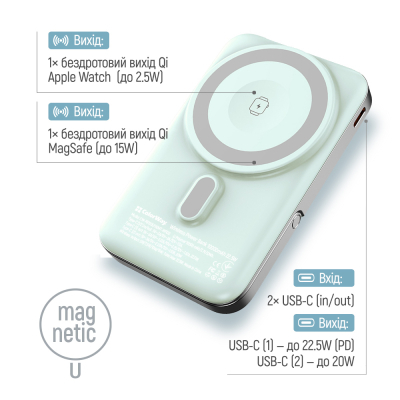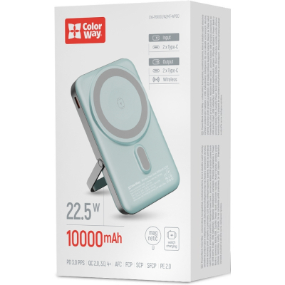 Батарея універсальна ColorWay 10 000 mAh PD/22.5W, 15W MagSafe & Watch Wireless Aquamarine (CW-PB100LPA2MT-WPDD)
