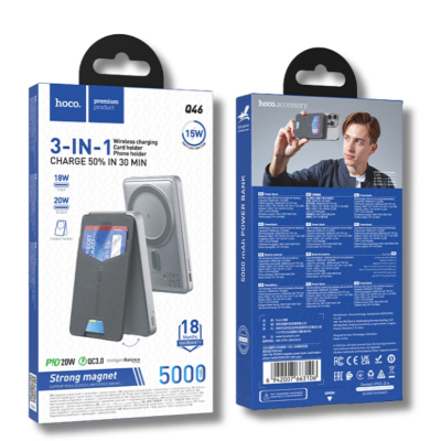 Повербанк Hoco Q46 Title PD20W Magnetic (5000 mAh) — це компактний магнітний повербанк формату 3-в-1, який поєднує в собі зовнішній акумулятор, бездротову зарядку Qi та зручний кардхолдер-підставку для смартфона.