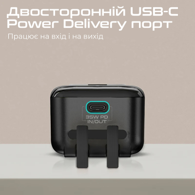 - Вихід 1: USB-C порт 5V/3A, 9V/3A, 12V/2.92A, 15V/2.33A, 20V/1.75A (PPS 35W PD)