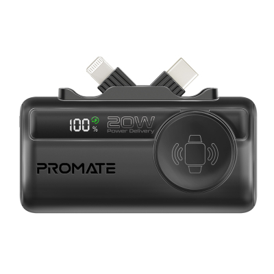 PowerUp-Trio від Promate - мініатюрний повербанк на 5000 mAh з USB-C портом, двома USB-C/Lightning штекерами та магнітним кріпленням для Apple Watch . Швидко зарядить твої пристрої та не займе багато місця.