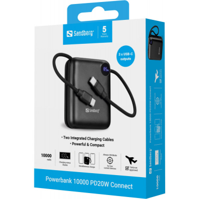 Універсальна мобільна батарея Sandberg 10000mAh 20W (421-26) забезпечить оптимальне зарядження USB пристроїв, коли ви знаходитесь поза електромережею. Батарея підтримує протоколи швидкого заряджання PD2.0, PD3.1, QC2.0, QC3.0. Вона оснащена портом USB Type-C з зарядною потужністю 18 Вт при використанні одного порта та двома вбудованими кабелями USB Type-C з потужністю 20 Вт та 22,5 Вт відповідно.
