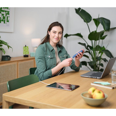 Ємність - 10000 mAh, електрохімічна система - Li-pol, Джерело заряду батареї - мережа 220 В, інтерфейси підключення (вихід) - USB Type-C, 2 х USB, вихідний струм - 3 A, 2.4 A, матеріал корпусу - пластик, вага - 230 г, Колір - блакитний