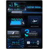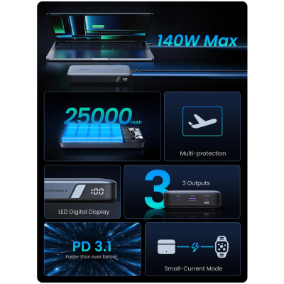 Ємність - 25000 mAh, електрохімічна система - Li-pol, Джерело заряду батареї - мережа 220 В, інтерфейси підключення (вихід) - 1 х USB, 2 x USB Type-C, вихідний струм - 3 A, 3.25 A, 2.25 A, розмір - 160 х 80 х 20 мм, матеріал корпусу - пластик, вага - 513 г, Колір - сірий