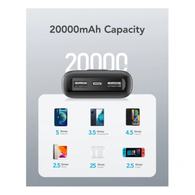 Ємність - 20000 mAh, електрохімічна система - Li-pol, Джерело заряду батареї - мережа 220 В, інтерфейси підключення (вихід) - 2 х USB, вихідний струм - 1.5 A, 3 A, 2.2 A, розмір - 147.8 х 67.5 х 27.5 мм, матеріал корпусу - пластик, вага - 412 г, Колір - чорний