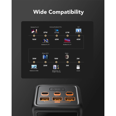 - Порти: USB-C (PD 130W), USB-A (QC 3.0), USB-A Smart