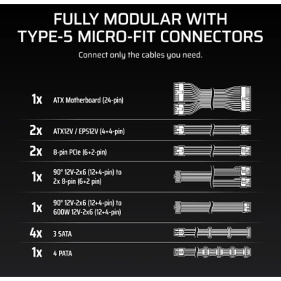 Кабелі блоку живлення CORSAIR типу 5 займають менше місця, що в поєднанні з модульною конструкцією спрощує організацію кабелів.