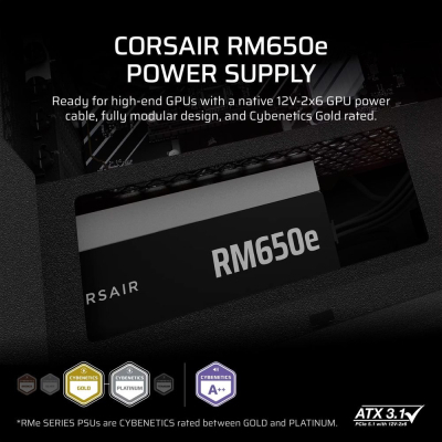 Повністю модульні низькошумні блоки живлення CORSAIR серії RMe оснащені спеціальним кабелем живлення 12 В-2x6 для графічного процесора, мають сертифікат ATX 3.1 і відповідають стандарту PCIe 5.1, а також мають ефективність Cybenetics Gold, що забезпечує тиху і надійну роботу. Компактний розмір блоків живлення RMe також полегшує керування кабелями.