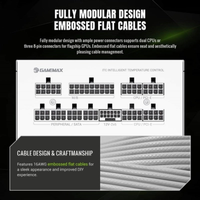 Модульний блок живлення GX PRO 1250G 80 Plus Gold: готовий до ATX3.1, безшумне охолодження та преміальна довговічність • Ефективність та тиха робота 80 Plus Gold: досягає 90% ефективності при типових навантаженнях завдяки конструкції APFC+LLC+DC-DC, мінімізуючи втрати енергії та шум. • Преміальна довговічність та надійність: виготовлений з японських конденсаторів 105°C та твердотільних конденсаторів для довготривалої стабільності та продуктивності. • Готовий до ATX3.1 та PCIe5.1: має вбудований роз'єм 12V-2x6 для безперебійної сумісності з відеокартами RTX 40/50 та ефективного живлення. • Розширене терморегулювання: 13,5-см вентилятор FDB з інтелектуальним контролем температури забезпечує тихе охолодження та оптимальне розсіювання тепла. • Модульна конструкція та надійний захист: повністю модульна конструкція з двоступеневим фільтром електромагнітних перешкод та захистом від перенапруги за допомогою термісторів NTC, а позолочені кабелі забезпечують міцні з'єднання з високою провідністю.