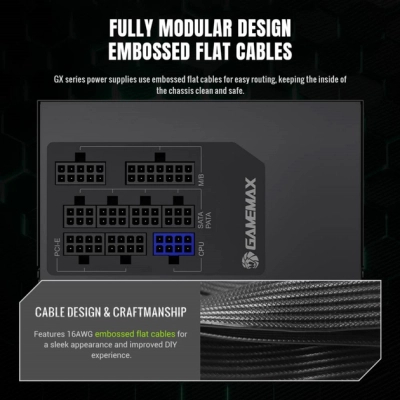 Модульний блок живлення GameMax GX 850GF, сертифікований за стандартом 80+ Gold, пропонує найвищу продуктивність у компактному корпусі. Основні характеристики: • Висока ефективність: понад 92% ефективності завдяки технологіям LLC та DC-DC для економії енергії. • Тиха та холодна: вентилятор FDB для тихої роботи та ефективного розсіювання тепла. • Модульна конструкція: просте управління кабелями для чистішої конструкції та покращеного повітряного потоку. • Стабільна та довговічна: повністю твердотільні конденсатори та SMT-компоненти забезпечують тривалу надійність. • Широка сумісність: підтримує найновіші відеокарти та повний діапазон вхідної напруги. • Захист: сім рівнів захисту захищають вашу систему від пошкоджень.