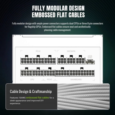 Повністю модульний блок живлення GameMax RGB 850G • Ефективність, сертифікована 80+ Gold: Досягає ефективності 90% або вище за типових навантажень, забезпечуючи нижче енергоспоживання, знижений шум та охолодження. • 140-мм вентилятор ARGB із синхронізацією: Забезпечує яскраві світлові ефекти та підтримує синхронізацію з материнськими платами ASUS, GIGABYTE, MSI та ASRock RGB для налаштування підсвічування. • Повністю модульна конструкція: 100% бездротове внутрішнє розташування друкованої плати усуває безлад кабелів для покращеного повітряного потоку та естетики. • Підвищена стабільність та надійність: Потужна одинарна лінія +12 В з високоякісними японськими конденсаторами забезпечує стабільну подачу живлення до відеокарт та компонентів ПК. • Розширений захист та надзвичайно тиха робота: Включає захист OPP/OVP/UVP/SCP/OCP/SIP у поєднанні з надзвичайно тихим 140-мм вентилятором для оптимального охолодження та мінімального шуму.