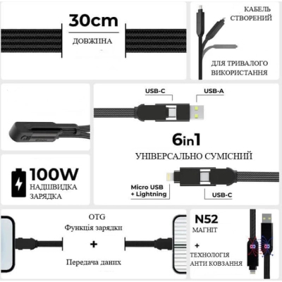 • 6 в 1 — підтримує всі популярні типи з’єднань: USB-A → USB-C; USB-A → Lightning; USB-A → Micro USB; USB-C → USB-C; USB-C → Lightning; USB-C → Micro USB