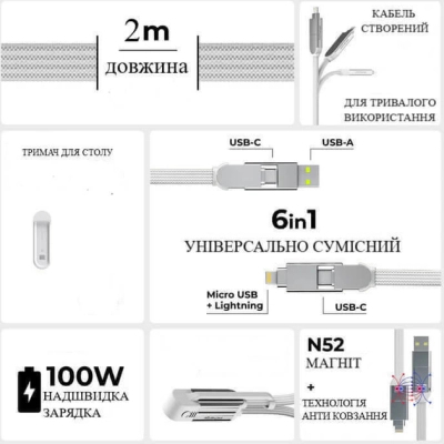 • 6 в 1 — підтримує всі популярні типи з’єднань: USB-A → USB-C; USB-A → Lightning; USB-A → Micro USB; USB-C → USB-C; USB-C → Lightning; USB-C → Micro USB