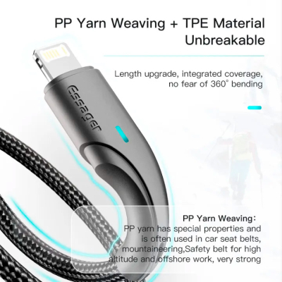 Essager Rousseau Fast Charging 2.4A USB Lightning виконаний з якісних матеріалів. По всій його поверхні можна виявити нейлонове захисне обплетення. Міцний матеріал не тріскається та не рветься. За рахунок нейлонового обплетення, кабель можна згинати на 360 °. Швидка зарядка – це ще не все. Кабель