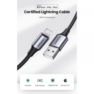 Ugreen USB AM-Lightning M (60156) - сертифікований MFі кабель для зарядки та передачі даних, який стане незамінним аксесуаром для власників iPhone, iPad та iPod. Він підтримує швидку зарядку до 2,4А та має швидкість обміну даними 480 Мбіт/с.