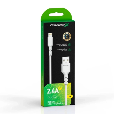 Дата кабель USB 2.0 AM to Lightning 1.0m 2.4A white Grand-X (PL-05W)