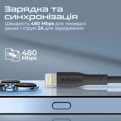 Тип - кабель, Тип конектора 1 - USB, Тип конектора 2 - Lightning, довжина - 1 м, Номінальний струм - 2 А, Колір - чорний