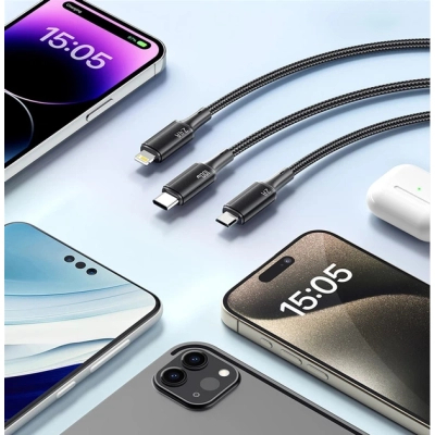 Кабель довжиною 1.2 метра має три роз'єми: USB Type-A для USB Type-C, Lightning та Micro USB, що забезпечує сумісність із широким спектром гаджетів. Завдяки міцній конструкції з алюмінієвого сплаву та міцного оплетення, кабель забезпечує довговічність та надійність. Крім того, кабель підтримує швидкість передачі даних до 480 Мбіт/с.