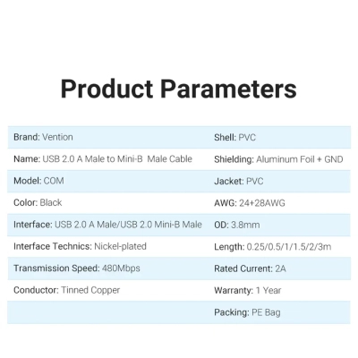 Високоякісний дата-кабель Vention USB 2.0 на Mini USB створений для забезпечення надійного з'єднання між комп'ютером, зарядним пристроєм та різноманітною технікою, оснащеною портом Mini-B. Завдяки довжині у 2 метри, цей аксесуар є ідеальним рішенням для автомобілістів, дозволяючи зручно підключити відеореєстратор або GPS-навігатор, проклавши кабель під обшивкою салону. Виріб також чудово підходить для фотографів, власників MP3-плеєрів, зовнішніх жорстких дисків та ігрових консолей PSP, гарантуючи стабільну синхронізацію та живлення. Виготовлений з міцних матеріалів, він забезпечує безперебійну роботу ваших гаджетів вдома, в офісі або під час подорожей.