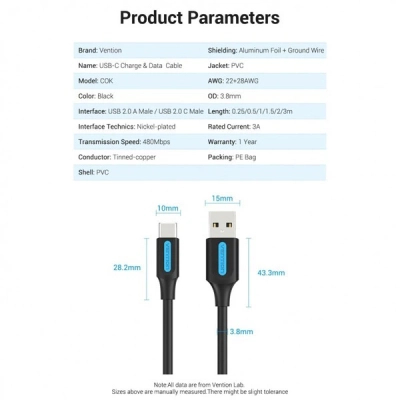 Зовнішній інтерфейсний кабель Vention USB 3.1 Type-C — USB 2.0 AM призначений для синхронізації, передачі даних, а також заряджання периферійних (мобільних) пристроїв та їх компонентів із роз'ємом USB Type C та USB 2.0.