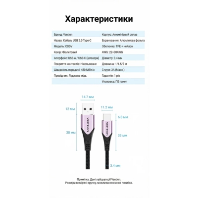 Кабель Vention USB-A на USB-C, 1.5 м, 3 А, швидка зарядка Quick Charge, передача даних 480 Мбіт/с, нейлонове обплетення, алюмінієві конектори, фіолетовий