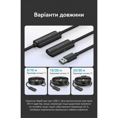 Для забезпечення безперебійної роботи підключеного обладнання на відстані 20 метрів користувач повинен враховувати енергоспоживання своїх пристроїв. Якщо ви плануєте використовувати цей подовжувач з технікою, яка споживає струм понад 0,5 А, наприклад, із зовнішніми жорсткими дисками або потужними Wi-Fi адаптерами, необхідно обов'язково підключити додаткове зовнішнє живлення через вбудований у корпус роз'єм USB-C. Це технічна вимога для уникнення падіння напруги та розривів з'єднання, оскільки стандартної потужності порту комп'ютера може не вистачити для живлення віддаленого пристрою через таку довжину кабелю.