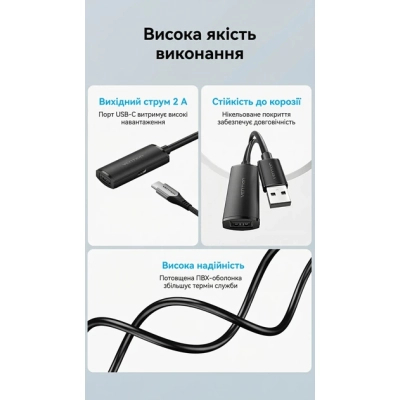 - Додатковий порт живлення USB-C: Інженери Vention передбачили можливість роботи з енергоємними пристроями, інтегрувавши в корпус вихідного роз'єму сучасний порт USB-C для подачі додаткового живлення. Це рішення значно розширює сумісність подовжувача, дозволяючи йому працювати не лише з простою периферією на кшталт мишок чи клавіатур, але й з жорсткими дисками великої ємності або професійними камерами відеоспостереження. Використання додаткового живлення стабілізує роботу підключеної техніки, усуваючи ризики раптового відключення або зависання через брак енергії на кінці довгої лінії.