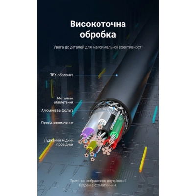 - Надійна архітектура екранування: Щоб забезпечити стабільну передачу сигналу без перешкод, у кабелі використовується складна багатошарова структура екранування. Внутрішні провідники з лудженої міді захищені комбінацією алюмінієвої фольги, металевого обплетення та спеціального проводу заземлення. Така комплексна конструкція ефективно нейтралізує електромагнітні перешкоди (EMI) та радіочастотні перешкоди (RFI), що є критично важливим для збереження цілісності даних на відстані 3 метри. Результатом є стабільне з'єднання без втрат сигналу або затримок, що особливо важливо при використанні чутливої периферії або ігрових контролерів.