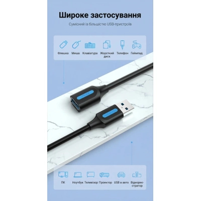 Подовжувальний кабель Vention USB 3.0 пропонує практичне та високопродуктивне рішення для збільшення радіуса дії ваших існуючих USB-з'єднань. Розроблений із значною довжиною 3 метри, цей кабель дозволяє легко підключати периферійні пристрої, такі як принтери, камери, клавіатури, миші та зовнішні жорсткі диски, які можуть знаходитися далеко від вашого комп'ютера або телевізора. Переміщуючи USB-порт у більш доступне місце, він усуває необхідність протискатися за меблями або повзати під столами, щоб підключити пристрої. Кабель має елегантний чорний дизайн, виготовлений з міцних матеріалів, що гарантує його гармонійне вписування в будь-який сучасний дім або офіс, забезпечуючи при цьому можливості високошвидкісної передачі даних, характерні для стандарту USB 3.0.