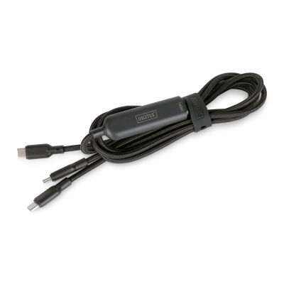 Кабель DIGITUS USB-C 2-в-1 призначений для заряджання та синхронізації двох USB-C пристроїв від одного джерела живлення. Підтримує Power Delivery 3.1 з максимальною потужністю до 140 Вт та автоматичний розподіл енергії між підключеними пристроями. У комплекті передбачена кабельна петля для акуратного зберігання.