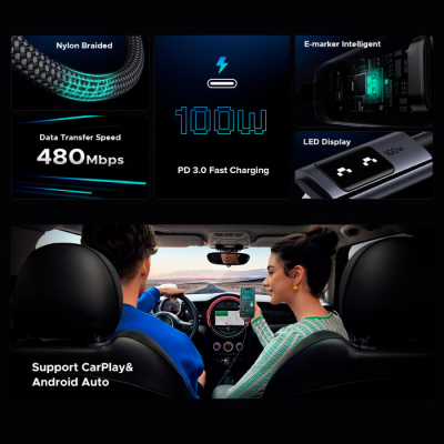 Тип - кабель, Тип конектора 1 - USB Type-C, Тип конектора 2 - USB Type-C, довжина - 1 м, 100 Вт, Колір - чорний