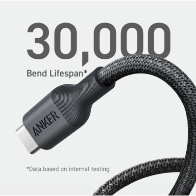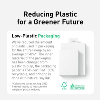 46% зовнішнього обплетення кабелю виготовлено з нейлону на біологічній основі, а 34% корпусу роз'єму виготовлено з використанням інших матеріалів на біологічній основі. Використання біоматеріалів у наших кабелях дозволяє нам скоротити використання пластику на нафтовій основі, такого як TPE.