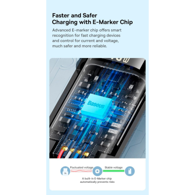 - Інтелектуальний чип: Вбудований електронний маркер (E-Marker Chip) автоматично регулює напругу та струм, гарантуючи безпечну та ефективну зарядку для кожного підключеного пристрою.