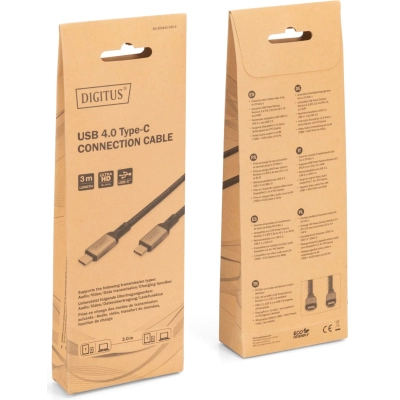 Кабель DIGITUS USB 4.0 Type-C – Type-C довжиною 3 м призначений для одночасної передачі даних, відео, аудіо та живлення між сумісними USB-C пристроями. Підтримує швидкість до 20 Гбіт/с, відео до 8K (7680 × 4320) при 60 Гц та заряджання Power Delivery до 100 Вт. Конектори з алюмінієвим корпусом і позолоченими контактами розраховані на інтенсивне підключення.