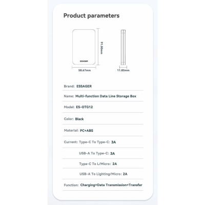 Кабель Essager Multifunctional Data cable storage box – одна з найкращих пропозицій на ринку мобільних аксесуарів, що поєднує кабель Type-C – Type-C, три перехідники та скріпку для вилучення SIM-карти, поміщені в компактний футляр, який дозволяє зі зручністю та повною безпекою брати весь набір з собою в подорожі та відрядження. На задній панелі боксу є висувний елемент, що дозволяє зручно встановити його під кутом, наприклад, на столі та використовувати як підставку для смартфона.