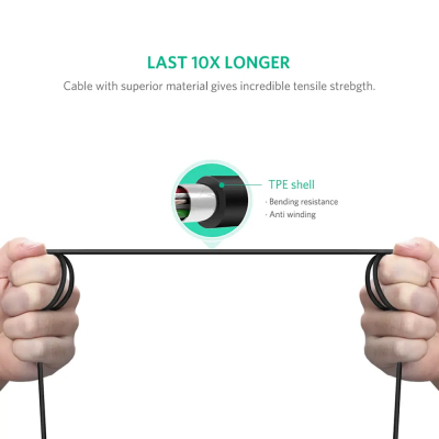 Потрійне екранування із лудженої міді, алюмінієвої фольги та заземлювального дроту захищає від електромагнітних перешкод від іншого електрообладнання та забезпечує стабільну та швидку передачу даних без перешкод та втрати сигналу. Лите розвантаження від натягу та оболонка з ТПЕ роблять кабель більш гнучким та міцним, що продовжує термін його служби.