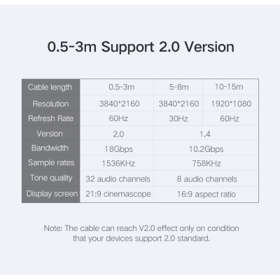 Підтримує 4K або 1080P Full HD, 3D, Ethernet-канал, максимальну глибину кольору 48 біт, зворотний аудіоканал (ARC), синхронізацію аудіо та відео, а також сумісність з HDCP.