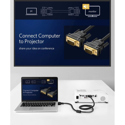 Кабель VGA дає змогу під'єднати комп'ютер або ноутбук із VGA до монітора, проєктора або телевізора з 15-контактним портом VGA (також відомим як HD-15, DE-15) для потокового передавання відео та ігор; сумісний з усіма пристроями, оснащеними гніздовим портом VGA. Зверніть увагу, що це 15-контактний кабель VGA SVGA "тато-тато", несумісний із кабелем DB9 RS232.
