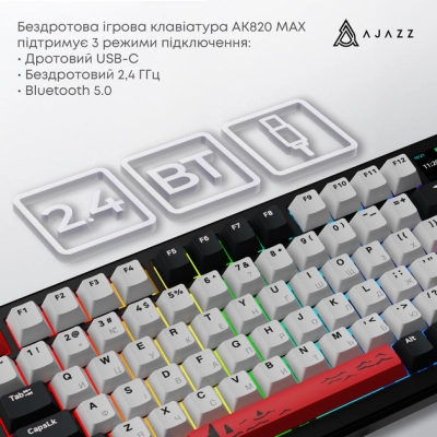Ajazz AK820 MAX — це компактна 75% механічна клавіатура, яка поєднує сучасний дизайн, потужну автономність та високу продуктивність. Вона підтримує три режими підключення (дротовий USB Type-C, Bluetooth 5.0 і 2.4 ГГц), що забезпечує зручність у використанні як для роботи, так і для ігор.
