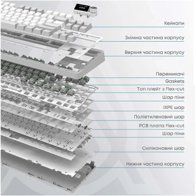 - Гаскетна структура для зменшення шуму та підвищення комфорту під час набору