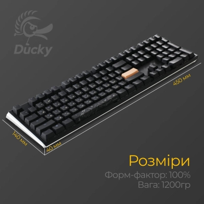 • Дизайн: Реалізований згідно з філософією Ducky «QUACK» Mechanics, дизайн поєднує естетику, функціональність та надійність, а також враховує приємну акустику та незрівнянний досвід набору тексту.