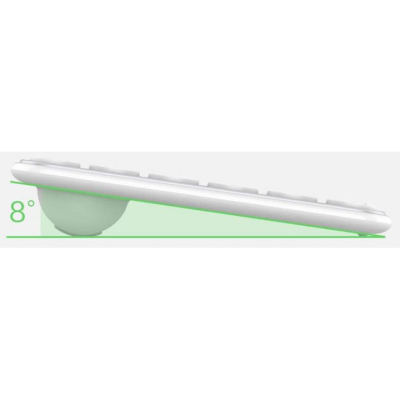 Клавіатура має кут нахилу 8°, підтримує бездротове з'єднання 2.4 ГГц і Bluetooth.