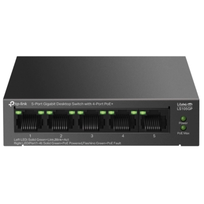 TP-LINK LS105GP — це компактний 5-портовий гігабітний комутатор, що забезпечує швидке й стабільне мережеве підключення. Чотири з п’яти портів підтримують PoE+ із загальним бюджетом 65 Вт, що дає змогу живити IP-камери, точки доступу чи телефони через один кабель.