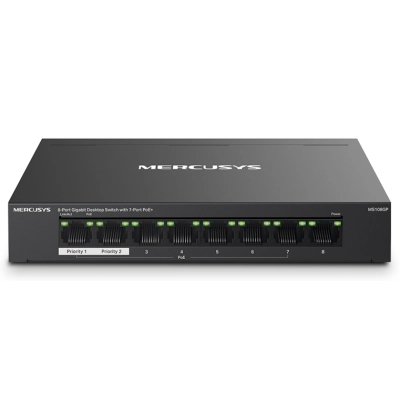 У комутатора MS108GP вісім портів, сім з яких підтримують технологію PoE+ (порти 1–7). Бюджет кожного порту PoE+ складає 30 Вт. Такі порти дозволяють подавати живлення до пристроїв стандартів 802.3af/at. Загальний бюджет PoE 65 Вт знадобляться в різних сценаріях. Наприклад, при розгортанні системи відеоспостереження в офісах та гуртожитках. Технологія PoE дозволяє подавати живлення на точки доступу, IP-телефони, комп'ютери, відеореєстратори та ряд інших пристроїв.