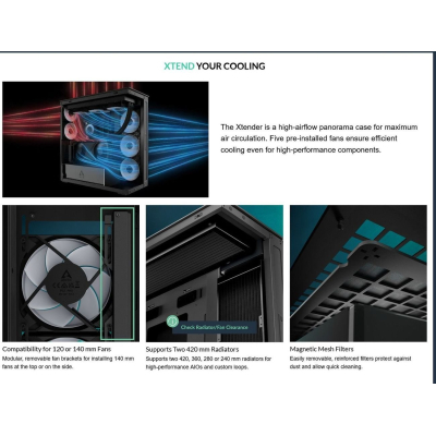 Ефективне охолодження Конструкція корпусу оптимізована для створення потужного повітряного потоку. Xtender Black підтримує встановлення великих радіаторів рідинного охолодження, що гарантує стабільність навіть при максимальних навантаженнях у сучасних іграх чи професійних застосунках.