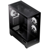 Перш за все, слід звернути увагу на його унікальний дизайн, що поєднує в собі сміливі рішення та відмінну практичність. Панорамні панелі із загартованого скла дозволяють милуватися внутрішніми компонентами вашої системи, створюючи ефект вітринної демонстрації. Це, у поєднанні з трьома вентиляторами ARGB 120 мм із зворотним розташуванням лопатей, забезпечує не лише ефективне охолодження, але й яскраве освітлення всередині. Ваш корпус не тільки буде функціональним, але й привабливо виглядатиме в будь-якому приміщенні.