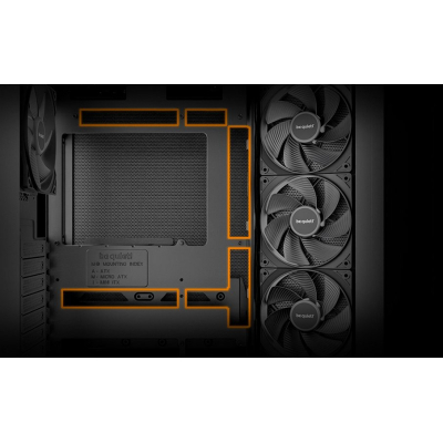Інженерні рішення Be quiet! забезпечують ефективну вентиляцію завдяки чотирьом попередньо встановленим вентиляторам Pure Wings 3 розміром 120 мм, що створюють потужний потік повітря з мінімальним рівнем шуму. Фахівці бренду також продумали розміщення додаткового охолодження: можна встановити до трьох вентиляторів на верхній решітці розміром 120 або 140 мм, а також канал для кабелів робить його вигляд організованим та естетичним.