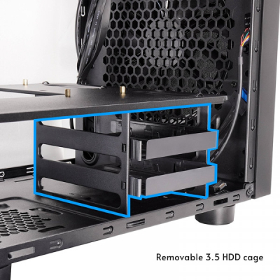 Корпус сумісний з блоками живлення АТХ та розрахований на встановлення відеокарт довжиною до 335 мм. Два відсіки для встановлення 3.5" HDD та два відсіки для 2.5" SSD забезпечують гнучкість конфігурації сховища.